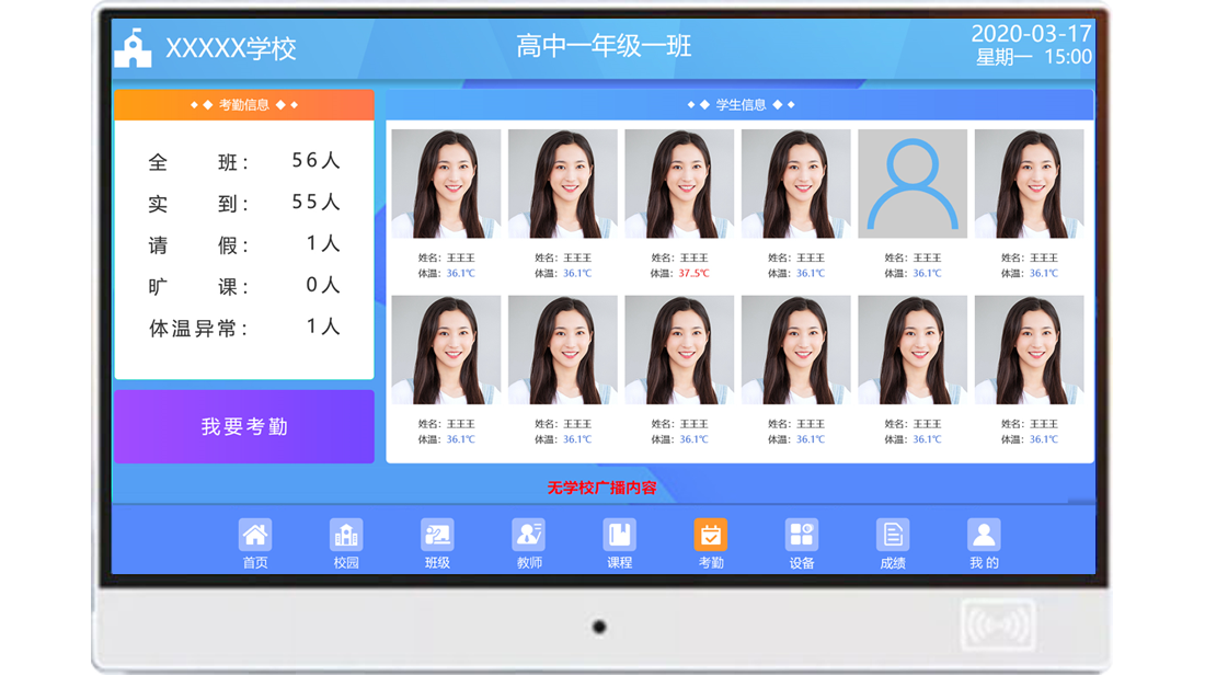 電子班牌可以準(zhǔn)確對(duì)比學(xué)生身份,人臉識(shí)別率可達(dá)到99.9%。
